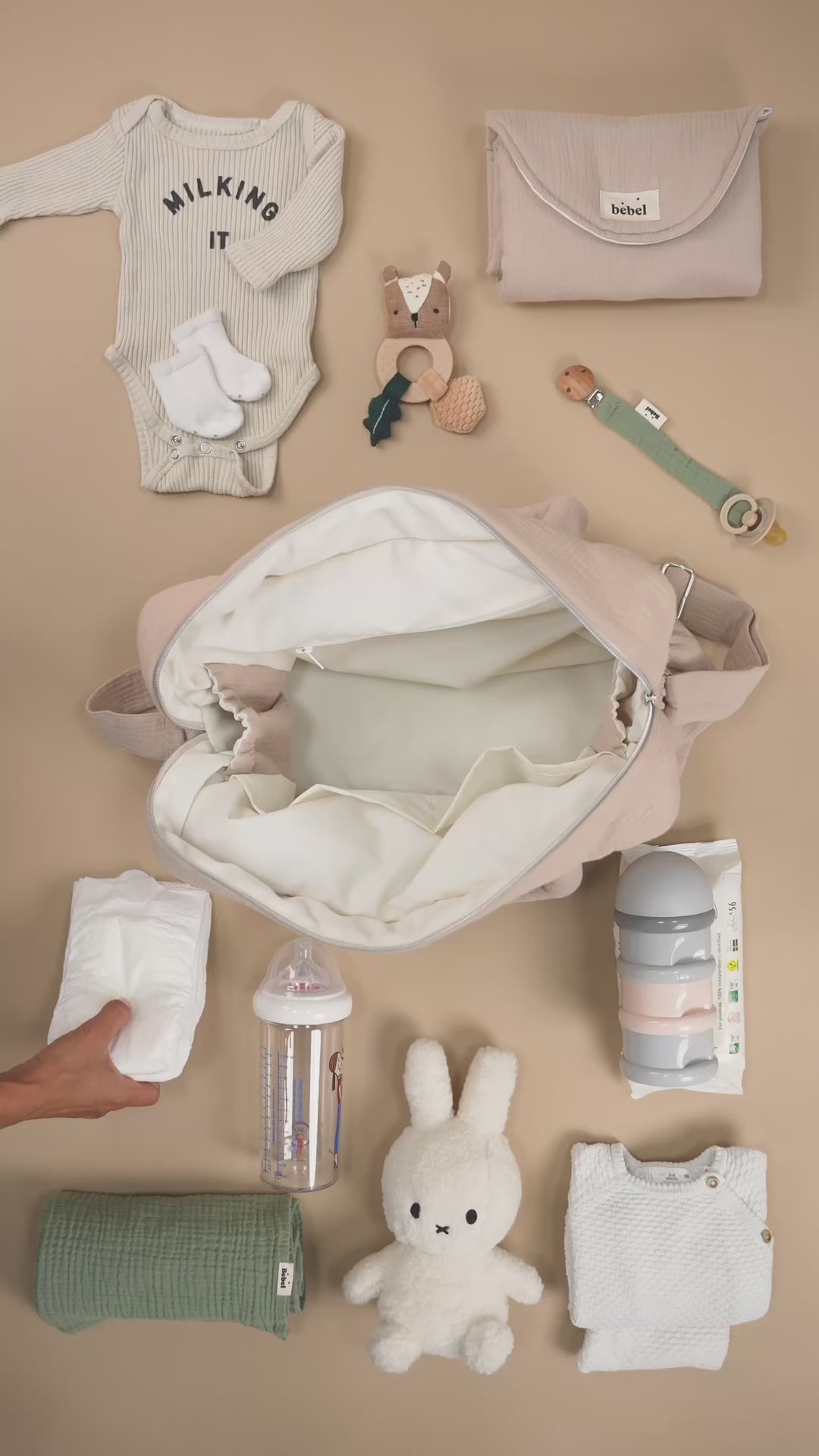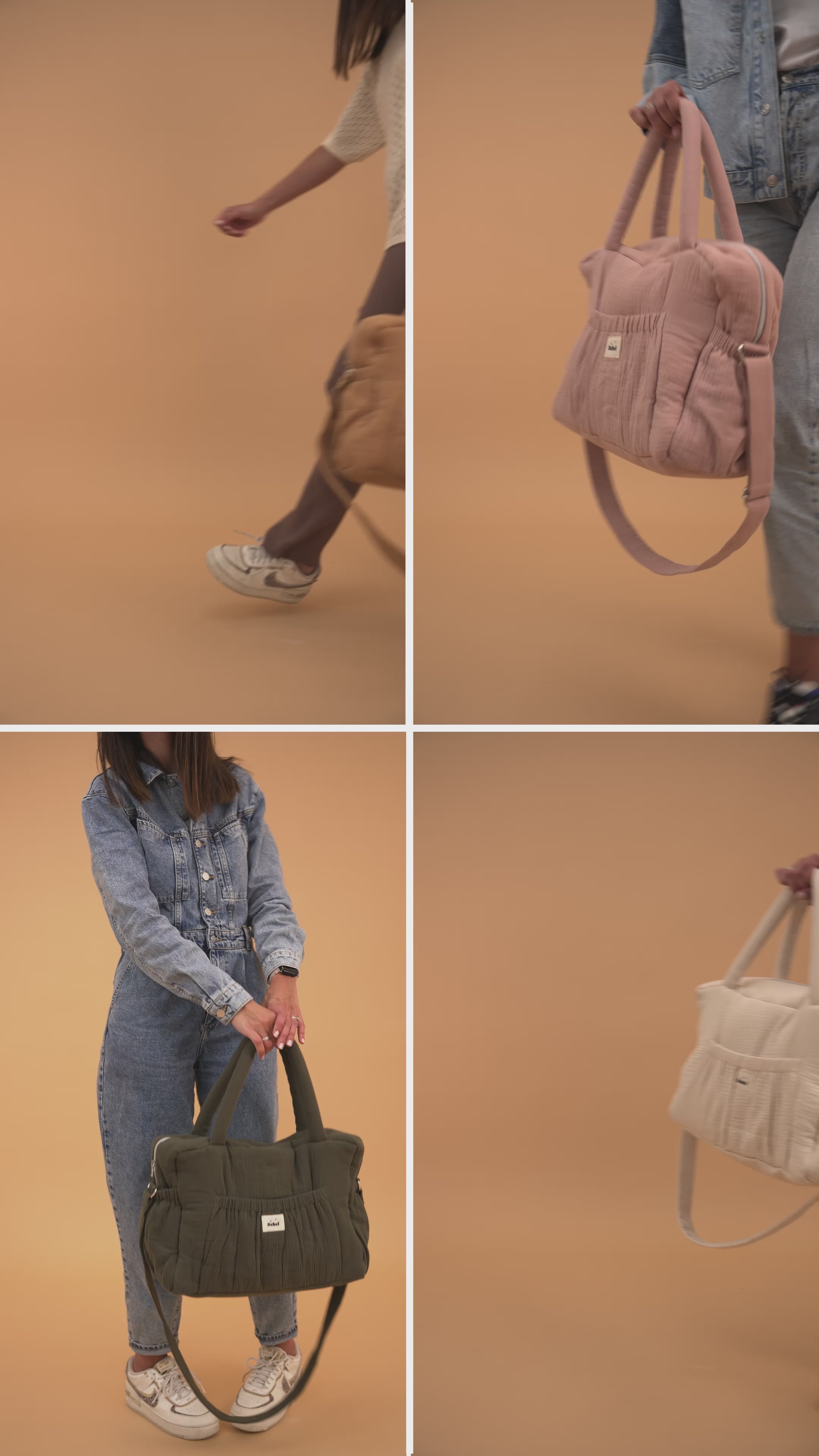 Collection Nomade avec le sac week-end, le sac à dos, la banane, le matelas à langer. (Coloris kaki, noir, beige, terracotta)